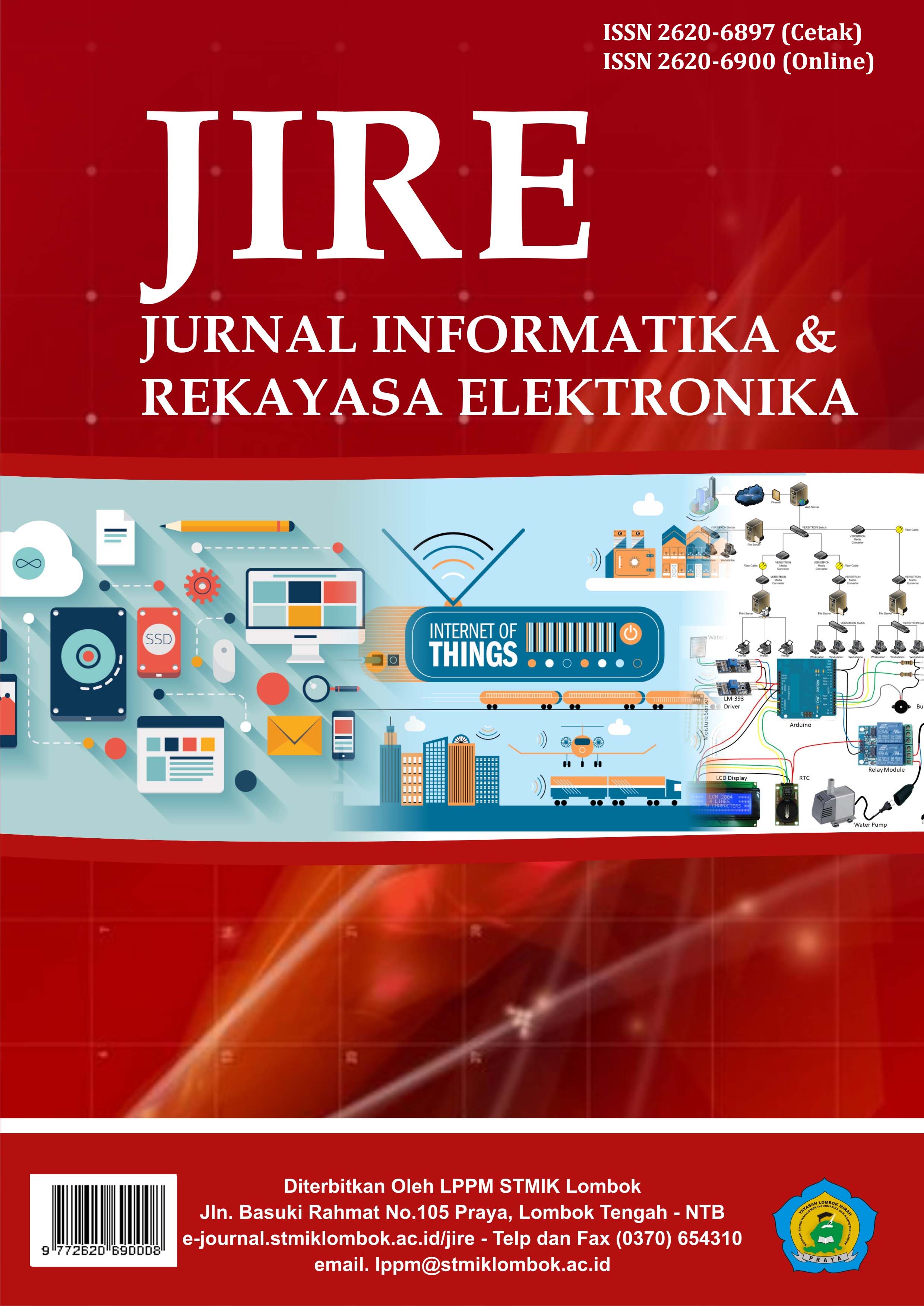 JIRE (Jurnal Informatika dan Rekayasa Elektronik) (eISSN: 2620-6900) diterbitkan oleh LPPM STMIK Lombok sebagai wadah untuk mempublikasikan artikel tentang pengetahuan baru dan penelitian dengan isu terkini yang berkaiatan dengan teknologi informasi, dengan topik Sistem Jaringan Komputer dan Komunikasi Data, Internet of Things (IoT), Sistem Kendali dan Otomasi, Komputasi Bergerak dan Komputasi Awan (Mobile and Cloud Computing), Keamanan Jaringan dan Informasi (Cybersecurity) dan Elektronika Terapan dan Sensor