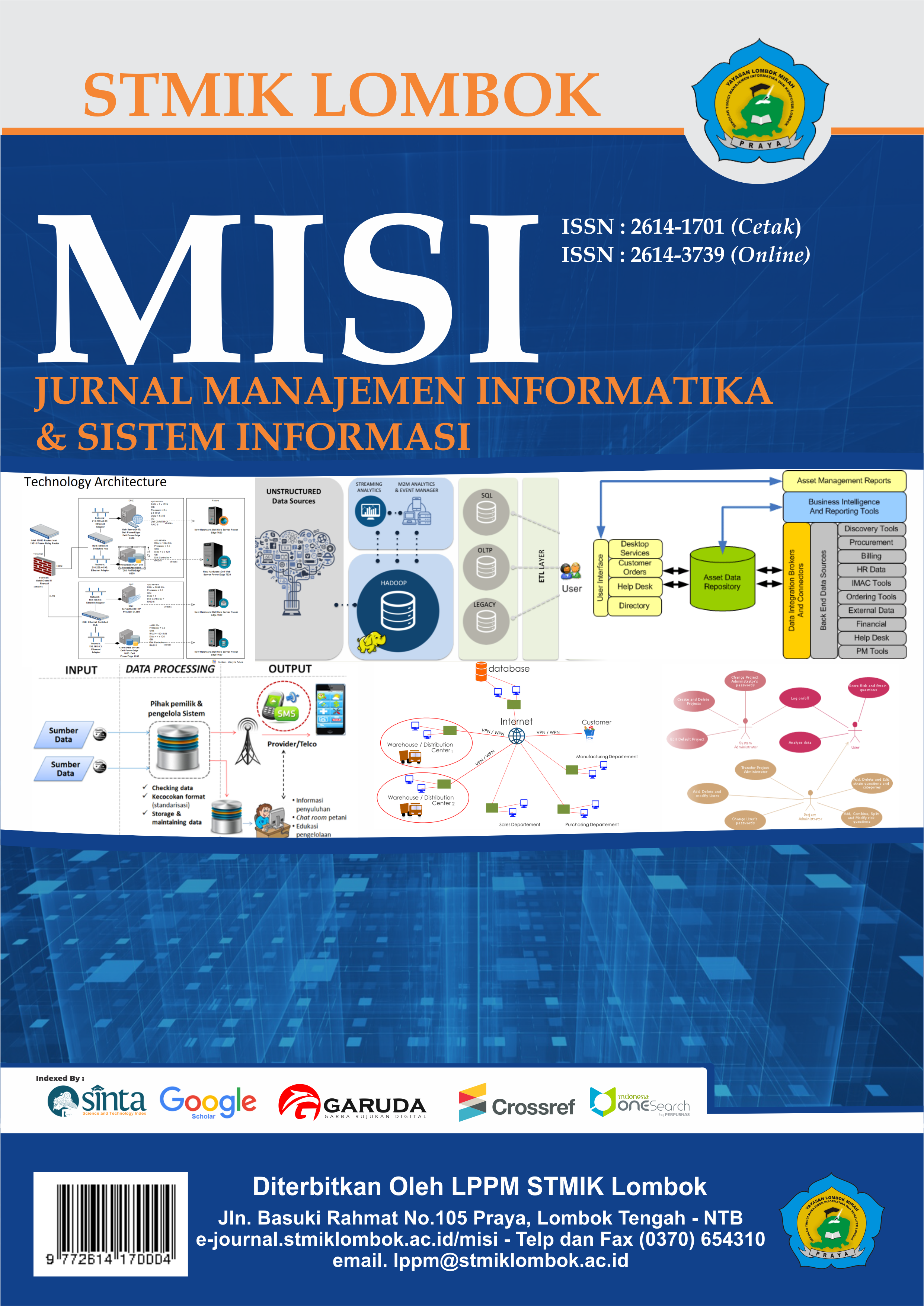 MISI (Jurnal Manajemen dan Sistem Informasi) diterbitkan oleh LPPM STMIK Lombok sebagai wadah untuk mempublikasikan artikel tentang pengetahuan baru dan penelitian dengan isu terkini yang berkaiatan dengan teknologi informasi, dengan topik Sistem Informasi, Rekayasa Perangkat Lunak, Audit Sistem Informasi, E-Goverment. Jurnal ini terbit 2 (dua) kali dalam setahun yaitu edisi Januari dan Juni. E-ISSN : 2614-3739