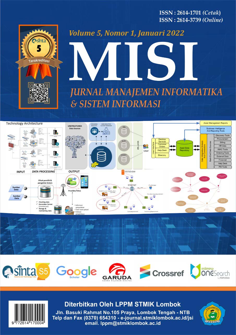Vol. 5 No. 2 (2022)MISI (Jurnal Manajemen dan Sistem Informasi) diterbitkan oleh LPPM STMIK Lombok sebagai wadah untuk mempublikasikan artikel tentang pengetahuan baru dan penelitian dengan isu terkini yang berkaiatan dengan Teknologi Informasi, dengan topik Informatika, Sistem Informasi, Rekayasa Perangkat Lunak, Audit Sistem Informasi, E-Goverment. Jurnal ini terbit 2 (dua) kali dalam setahun yaitu pada bulan Januari dan Juni. E-ISSN : 2614-3739