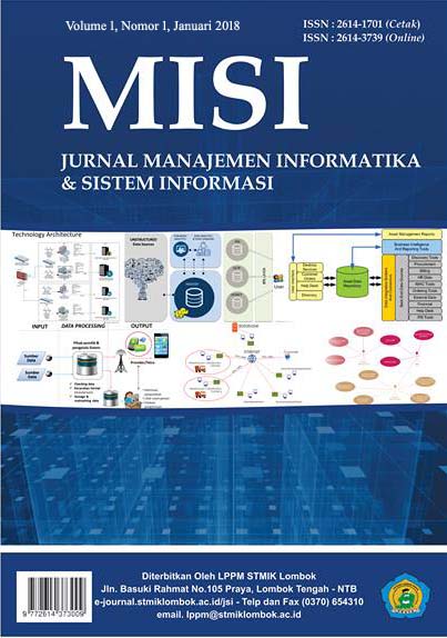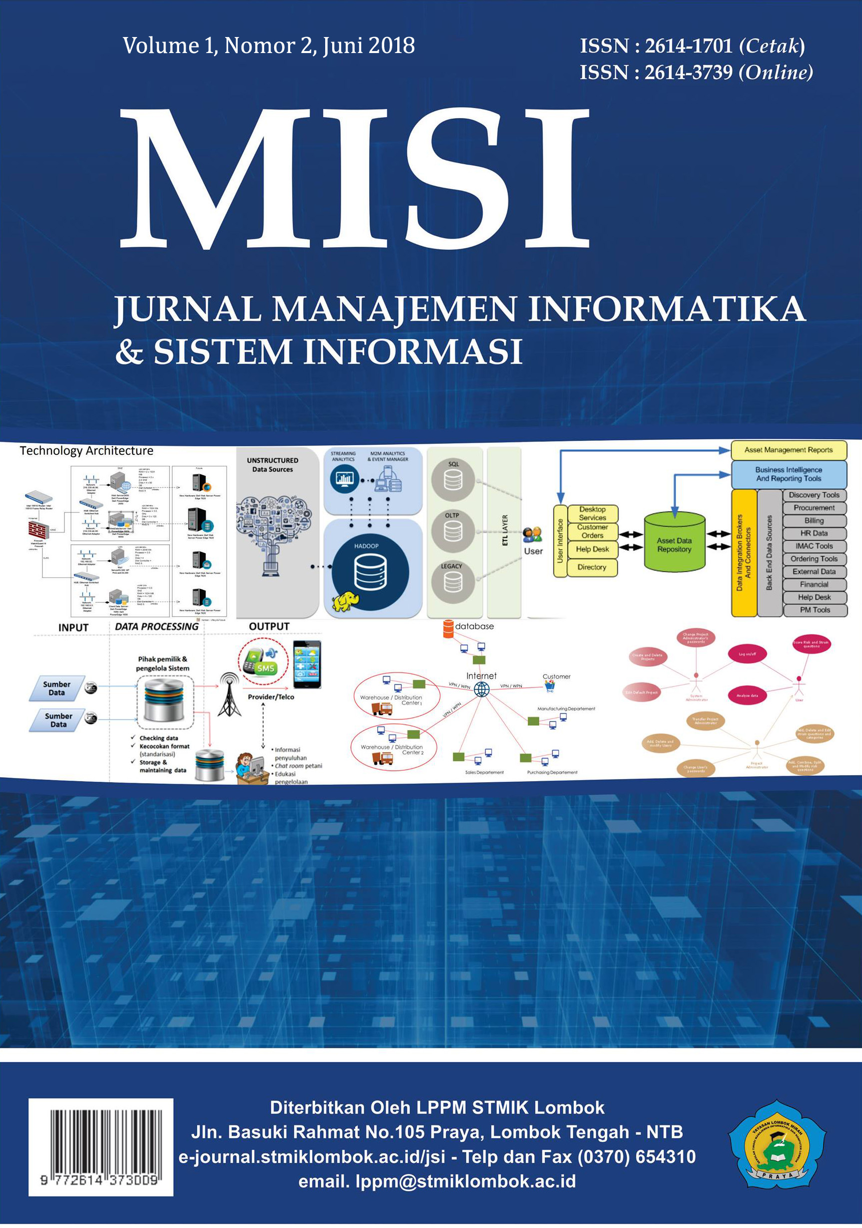 Vol. 1 No. 2 (2018)MISI (Jurnal Manajemen Informatika dan Sistem Informasi) diterbitkan oleh LPPM STMIK Lombok sebagai wadah untuk mempublikasikan artikel tentang pengetahuan baru dan penelitian dengan isu terkini yang berkaiatan dengan teknologi informasi, dengan topik Sistem Informasi, Rekayasa Perangkat Lunak, Audit Sistem Informasi, E-Goverment. Jurnal ini terbit 2 (dua) kali dalam setahun yaitu pada bulan Januari dan Juni. E-ISSN : 2614-3739
