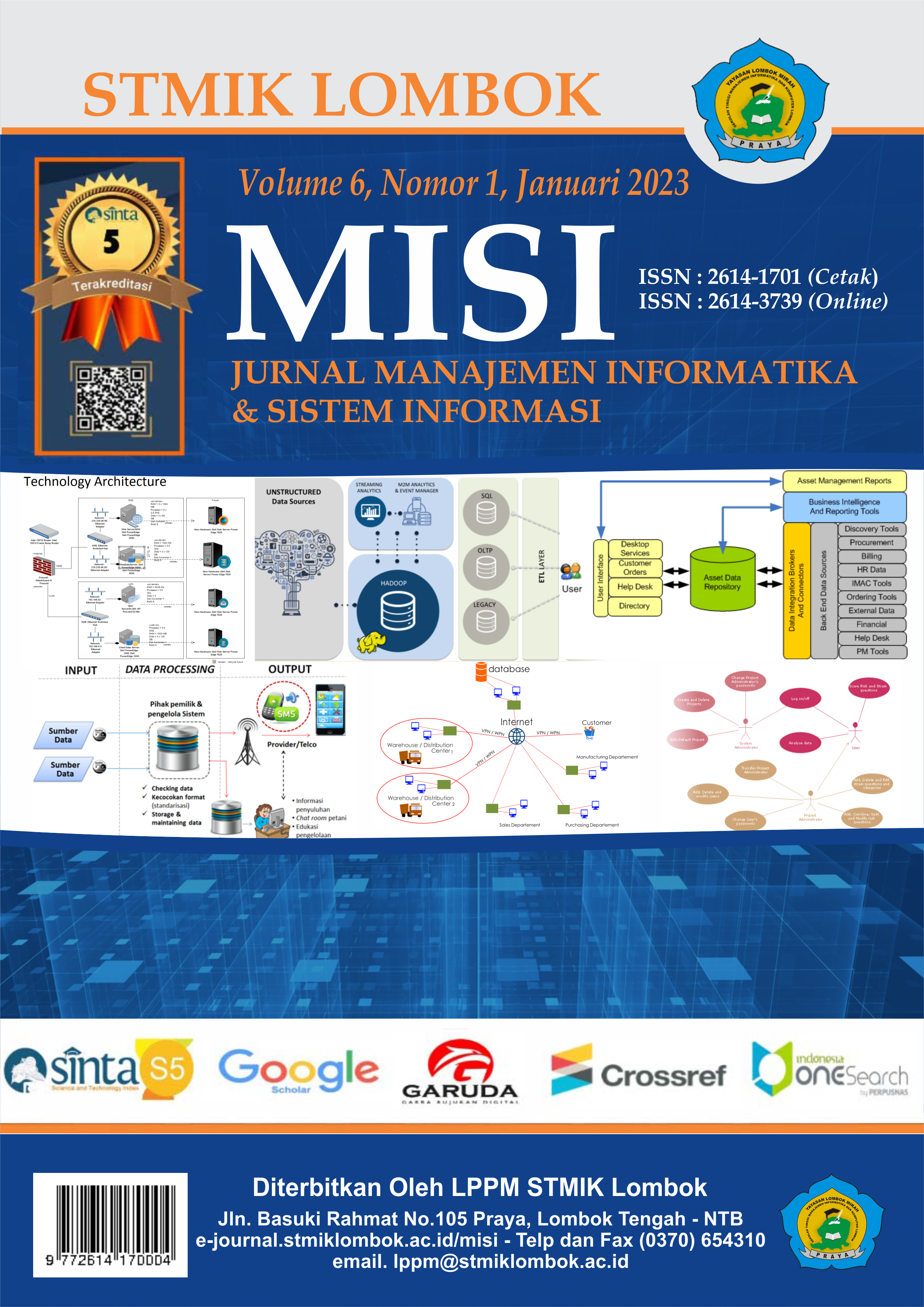 Vol. 6 No. 1 (2023)MISI (Jurnal Manajemen dan Sistem Informasi) diterbitkan oleh LPPM STMIK Lombok sebagai wadah untuk mempublikasikan artikel tentang pengetahuan baru dan penelitian dengan isu terkini yang berkaiatan dengan Teknologi Informasi, dengan topik Informatika, Sistem Informasi, Rekayasa Perangkat Lunak, Audit Sistem Informasi, E-Goverment. Jurnal ini terbit 2 (dua) kali dalam setahun yaitu pada bulan Januari dan Juni. E-ISSN : 2614-3739