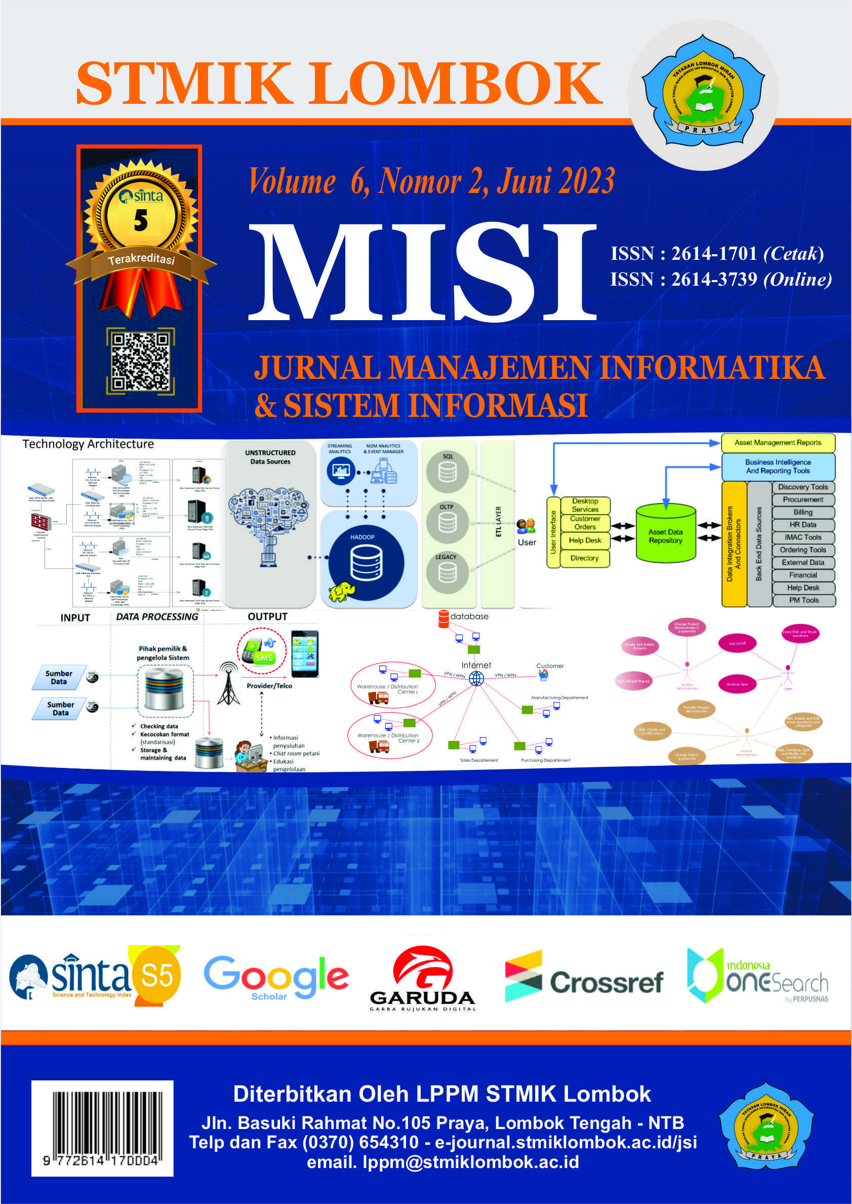 Vol. 6 No. 2 (2023)MISI (Jurnal Manajemen dan Sistem Informasi) diterbitkan oleh LPPM STMIK Lombok sebagai wadah untuk mempublikasikan artikel tentang pengetahuan baru dan penelitian dengan isu terkini yang berkaiatan dengan Teknologi Informasi, dengan topik Informatika, Sistem Informasi, Rekayasa Perangkat Lunak, Audit Sistem Informasi, E-Goverment. Jurnal ini terbit 2 (dua) kali dalam setahun yaitu pada bulan Januari dan Juni. E-ISSN : 2614-3739