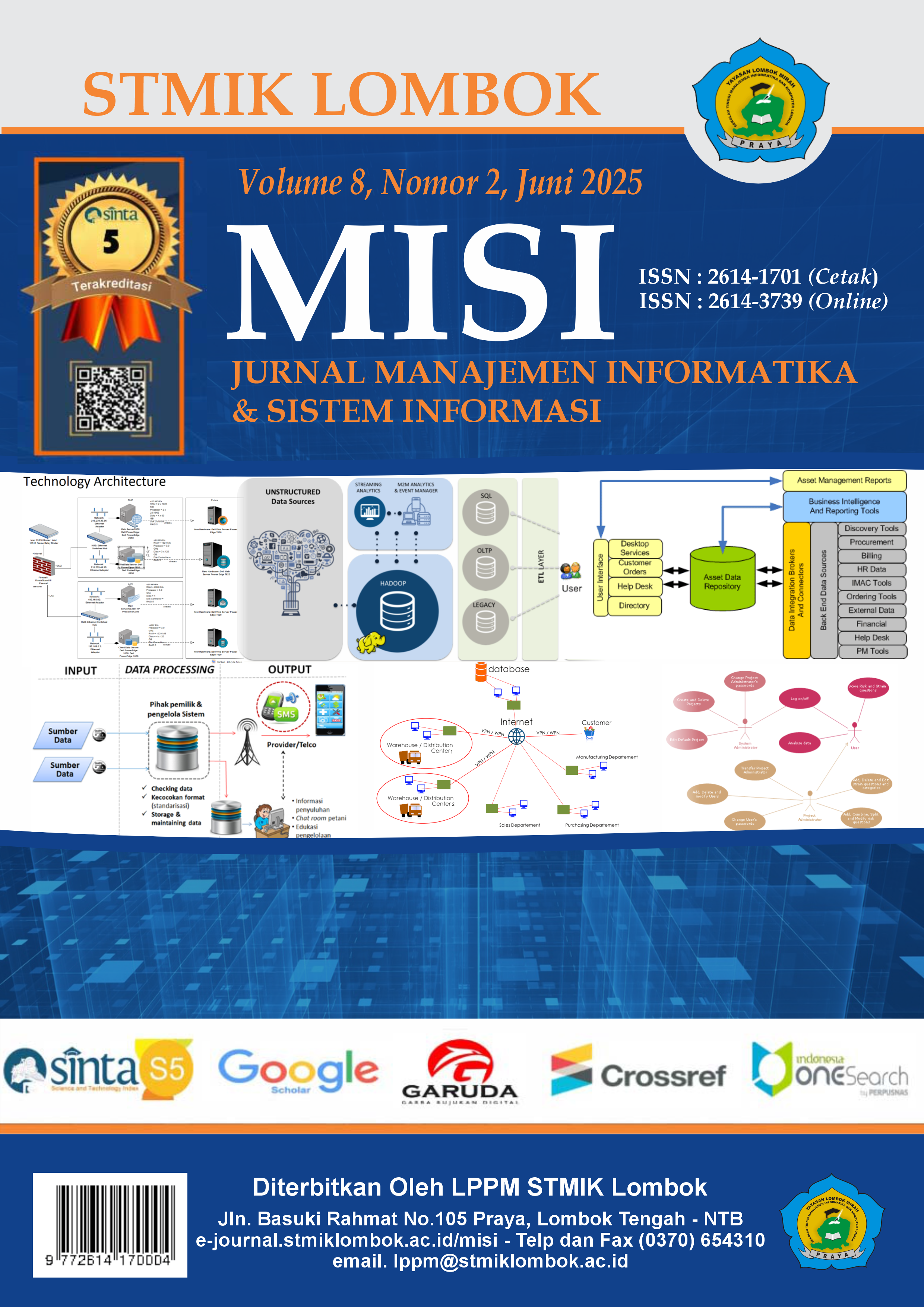 Vol. 8 No. 2 (2025)MISI (Jurnal Manajemen dan Sistem Informasi) diterbitkan oleh LPPM STMIK Lombok sebagai wadah untuk mempublikasikan artikel tentang pengetahuan baru dan penelitian dengan isu terkini yang berkaiatan dengan Teknologi Informasi, dengan topik Informatika, Sistem Informasi, Rekayasa Perangkat Lunak, Audit Sistem Informasi, E-Goverment. Jurnal ini terbit 2 (dua) kali dalam setahun yaitu pada bulan Januari dan Juni. E-ISSN : 2614-3739